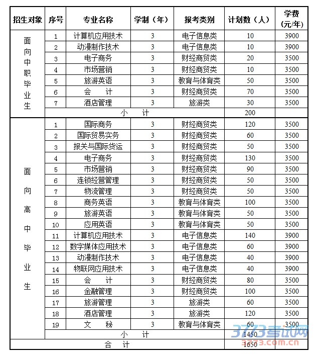 学校分类考试招生总计划1650人,其中面向应历届普通高中毕业生计划1450人,面向应历届中职(含技工学校、职业高中)毕业生计划200人,我校将根据报考人数等情况适当调剂分专业计划。