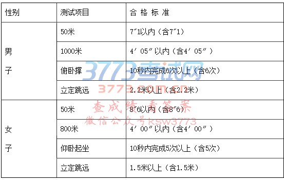 2.中国人民公安大学、中国刑事警察学院、铁道警察学院、南京森林警察学院、江西警察学院、云南警官学院、安徽公安职业学院招收参加2017年全国高考的高中毕业或具有同等学力的未婚考生,年龄不超过22周岁(1995年8月31日后出生)。考生面试具体分为目测面试、体能测试两个部分,依次序进行,上一项目检查合格者,方能参加下一项目的检查。目测面试标准按照公安部、教育部《关于做好2017年公安普通高等院校招生工作的通知》、《公安普通高等学校招生工作暂行办法》(公政治[2000]137号)及人力资源和社会保障部、教育部、卫生部《关于进一步规范入学和就业体检项目维护乙肝表面抗原携带者入学和就业权利的通知》(人社部发[2010]12号)等有关文件规定执行。主要条件如下:男性考生身高不低于1.70米,体重不低于50公斤;女性考生身高不低于1.60米,体重不低于45公斤,身体匀称;对过于肥胖或消瘦的考生要严格控制(标准体重<千克>=身高<厘米>-110),实际体重超过标准体重25%以上者为过于肥胖,实际体重低于标准体重15%以上者为过于消瘦;双眼裸视力均不低于4.8(含文、理科);无色盲、色弱;两耳无重听;无口吃;五官端正,面部无明显特征和缺陷(如唇裂、对眼、斜眼、斜颈、各种疤麻等),嗅觉不迟钝、无鸡胸、无腋臭、无严重静脉曲张,无明显八字步、罗圈腿,无重度平跖足(平脚板),无纹身、少白头、驼背,无各种残疾,直系血亲无精神病史。无传染病。根据教育部高校学生司《关于明确慢性肝炎病人并且肝功能不正常的具体判定标准的函》(教学司函[2010]22号)规定,对转氨酶超过参考值上限指标2倍以上(含2倍)者,要进行B超复查,B超复查诊断肝部弥漫性病变者(脂肪肝除外),体检结论为不合格。体能测试标准按照修订后的《公安院校体能测试项目及标准》执行。目测面试和体能测试两项都合格的考生,由户籍地或居住地的公安机关组织政治审查。
