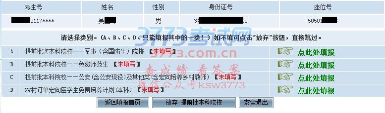 考生根据自己意愿选择要填报的批次,点击绿色“点此处填报”进入志愿填报页面。