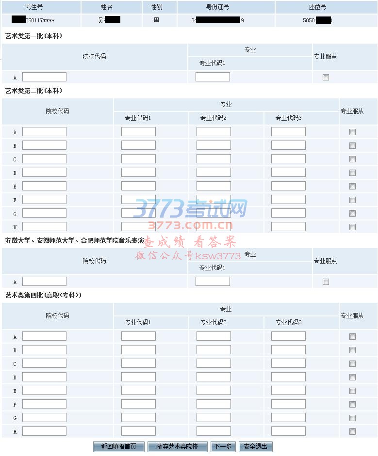 “放弃艺术类院校”按钮:放弃艺术类院校志愿,不填报艺术类的院校。一旦放弃,考生将不能被该类院校录取,请慎重操作。