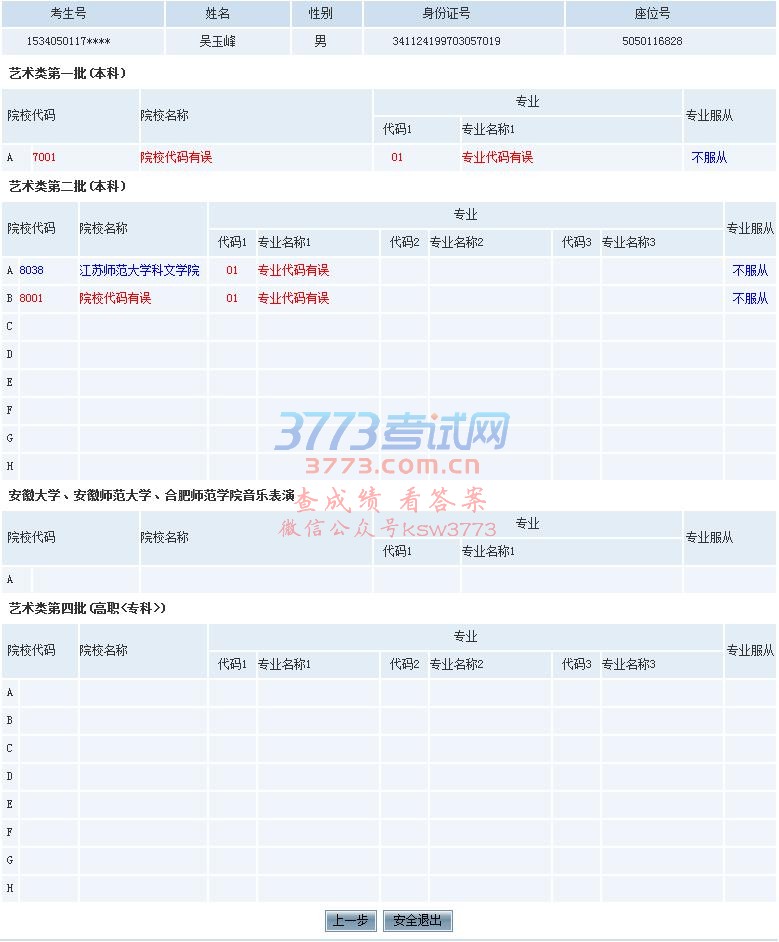 志愿信息经系统逻辑检查,蓝色字体表示通过检查的院校名称和专业名称。红色字体表示该院校志愿或专业志愿填写的不符合要求,同时告知不符合要求的原因。