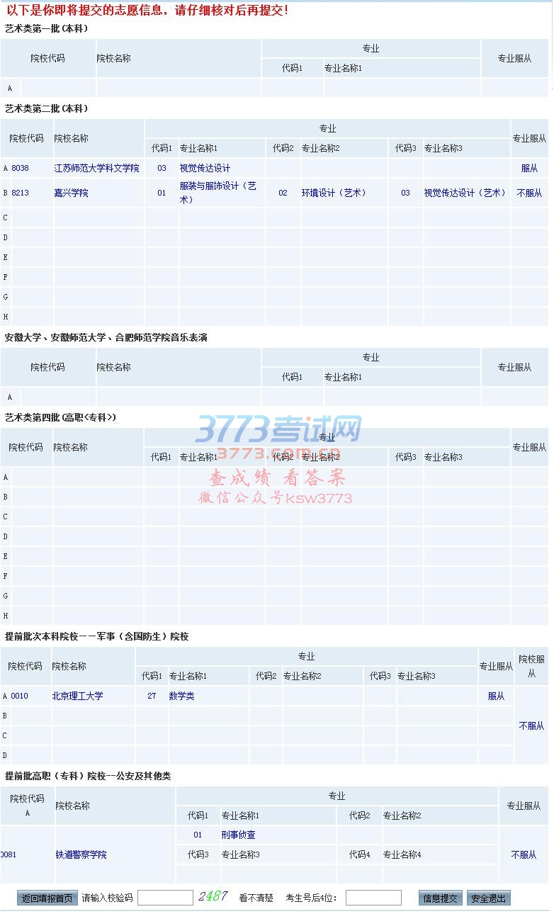志愿核对确认提交页面示例: