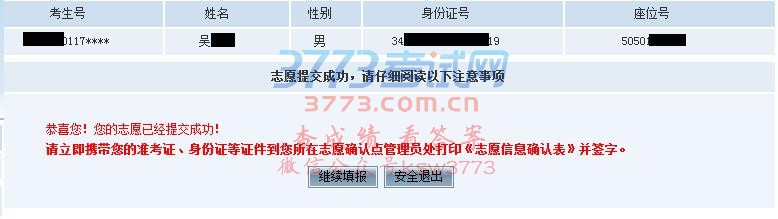 信息提交成功后将看到下面的页面,如果下面的页面没有出现,可能您的志愿没有填报成功,请到志愿填报点老师处咨询。