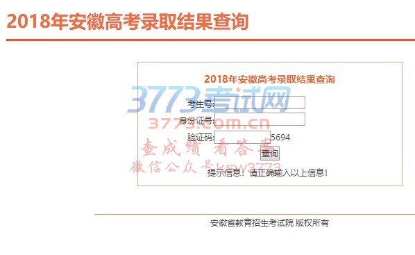 2018年安徽高考录取结果查询2018年安徽高考录取结果查询考生号:身份证号:验证码:5694查询提示信息:请正确输入以上信息!安徽省教育招生考试院 版权所有
