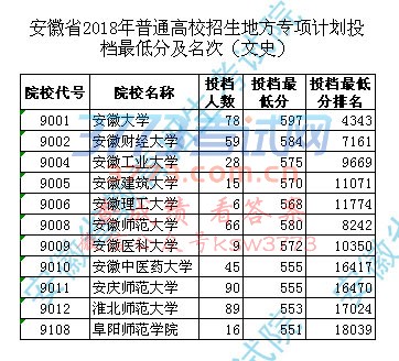 2018安徽高考地方专项计划投档最低分及名次(文史)