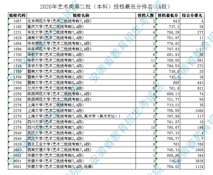2020安徽艺术类第二批(本科)投档最低分排名(A段)