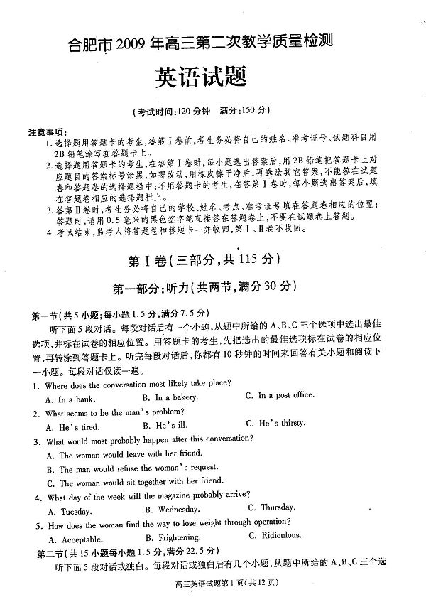 2009年安徽合肥市高考二模考试英语试卷