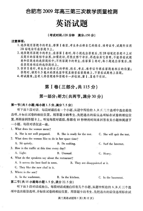 2009年合肥市三模英语试卷答案及评分标准整理发布中!
