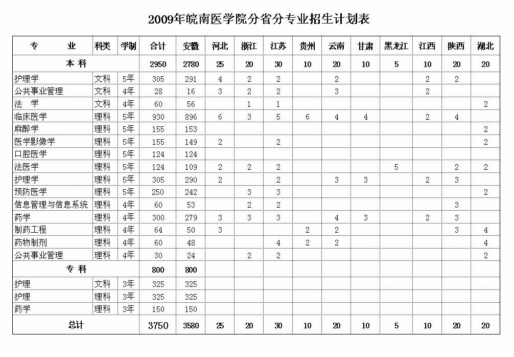 南方医科大学人文社会科学学院2009年普高招生计划总表