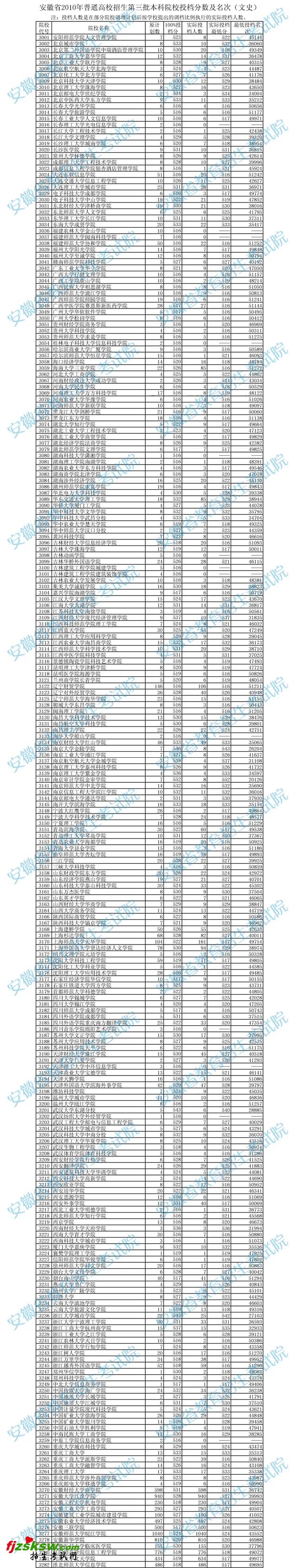 我省2010年普通高校招生录取普通文理科三本批次院校已经正式投档。现将《安徽省2010年普通高校招生第三批本科院校投档分数及排名》予以公布。为进一步加大信息公开力度,深入实施“阳光工程”,今年我省公布的数据,增加了各院校原计划数(即报考指导公布的招生计划数)、原计划100%投档分和实际投档人数(即经过两轮预投档后,按照学校调增计划后确定的投档比例执行的实际投档人数)。