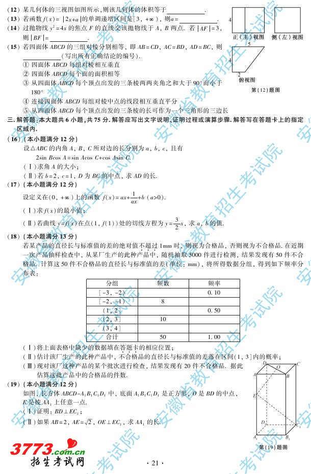 2012年安徽省普通高等学校招生统一考试试题答案(文科数学)