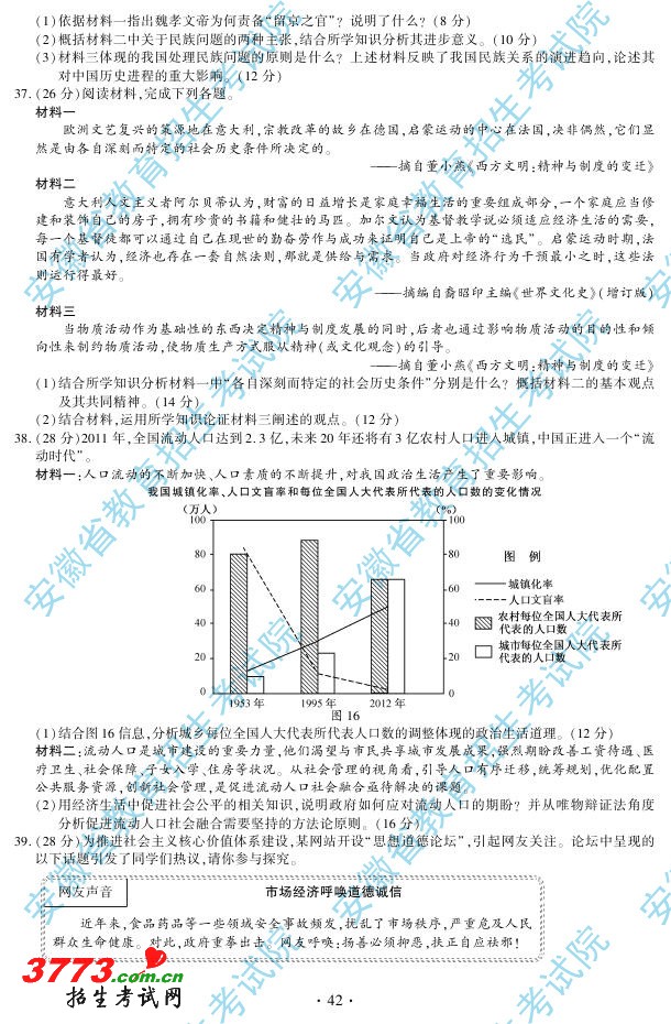 2012年安徽省高考试题及答案(文科综合)