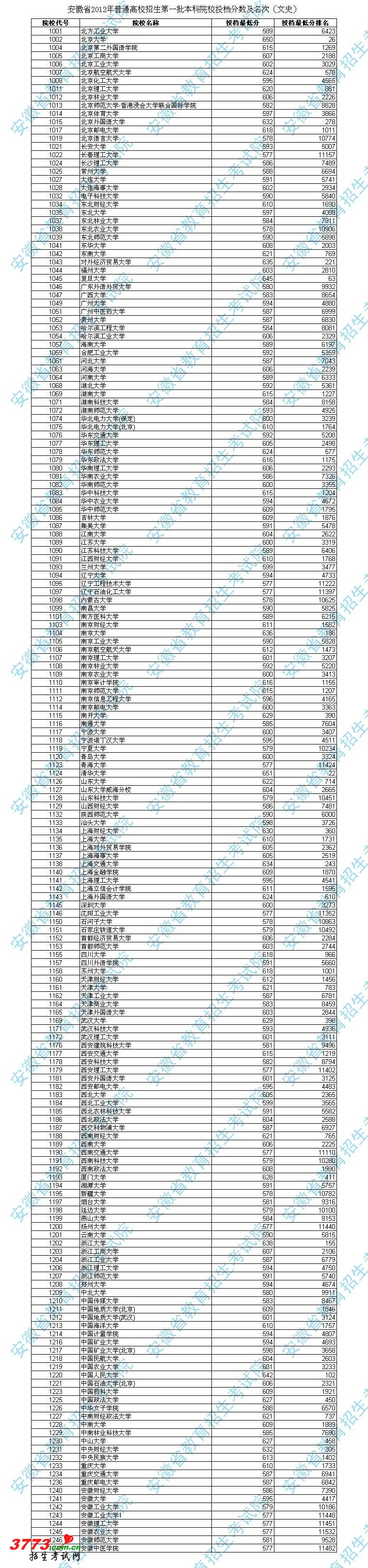 2012年安徽高考第一批本科院校投档分数及名次(文史)