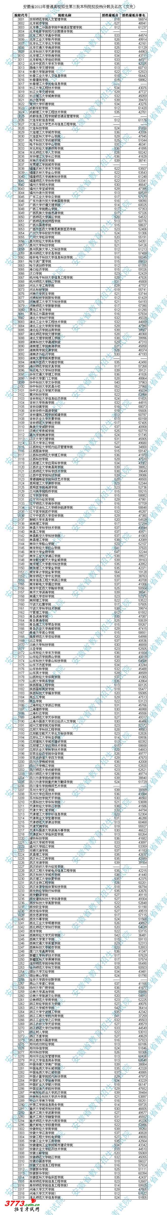 安徽省2012年普通高校招生第三批本科院校投档分数及名次(文史)