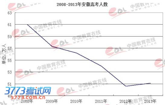 中国教育在线了解到,安徽2013年高考51.1万人参加,比2012年的50.6万人增加了1%。同时,这也是安徽高考人数至2009年以来,连续4年降的首次反弹。