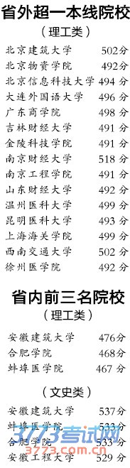 其中,理工类院校中,安徽建筑大学最低投档分为476分,高出二本线47分(去年是58分)投档,比一本线低14分;合肥学院投档分是468分,高出二本线39分(去年高出43分),名次提升一位;蚌埠医学院排名第三,提档线是467分,高出二本线38分。