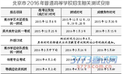 据北京教育考试院高招负责人介绍,参加这些考试的考生要先参加2015年11月9日8时至12日20时的高考网上报名。高水平艺术团招生统一测试、美术类专业统一考试、外语口试、体育专业考试这四项考试报名同期举行。