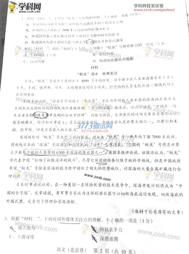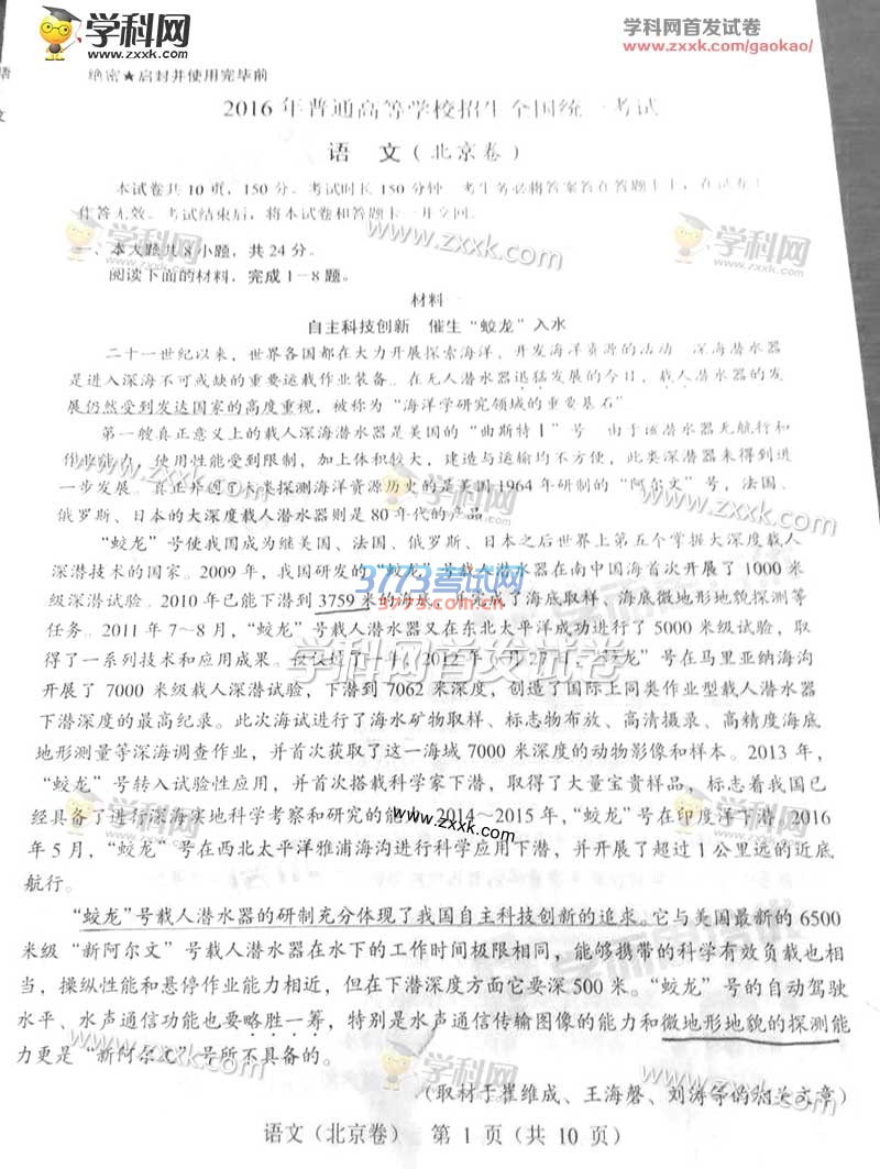 2016北京高考语文试题及答案(试题发布)