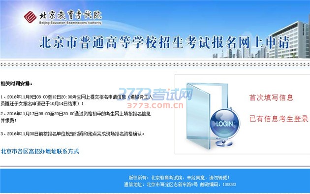 相关时间安排:1、2016年11月9日08:00至12日20:00考生网上提交报名申请信息(进城务工人员随迁子女报名申请已于10月14日结束);2、2016年11月17日08:00至20日20:00通过资格初审的考生网上填报报名信息并缴费;3、2016年11月30日前按报名单位规定时间和地点完成现场报名资格确认。北京市各区高招办地址联系方式