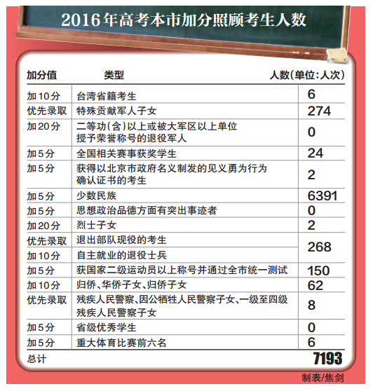 据北京考试院2016年公布的高招照顾对象名单,在全市61222名高考生中,有7193人次可享受加分或优先录取的优惠,比2015年减少11%。在众多加分项目中,“少数民族”人数最多。2016年有6391名少数民族考生可加5分,占加分照顾学生总数的近9成。