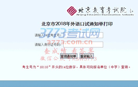 北京市2018年外语口试通知单打印 请输入14位考生号: 请输入身份证号码: 查询通知单 重新输入 考生号为“18110”开头的14位数字,具体可向报名单位(中学)查询。