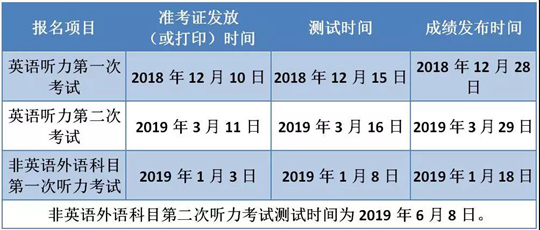 北京市2019年普通高考外语听力考试时间确定(如下表),一年安排两次。与2018年不同的是,2019年高考听力两次考试报名一次完成,考生要在高考报名时选择外语听力考试项。