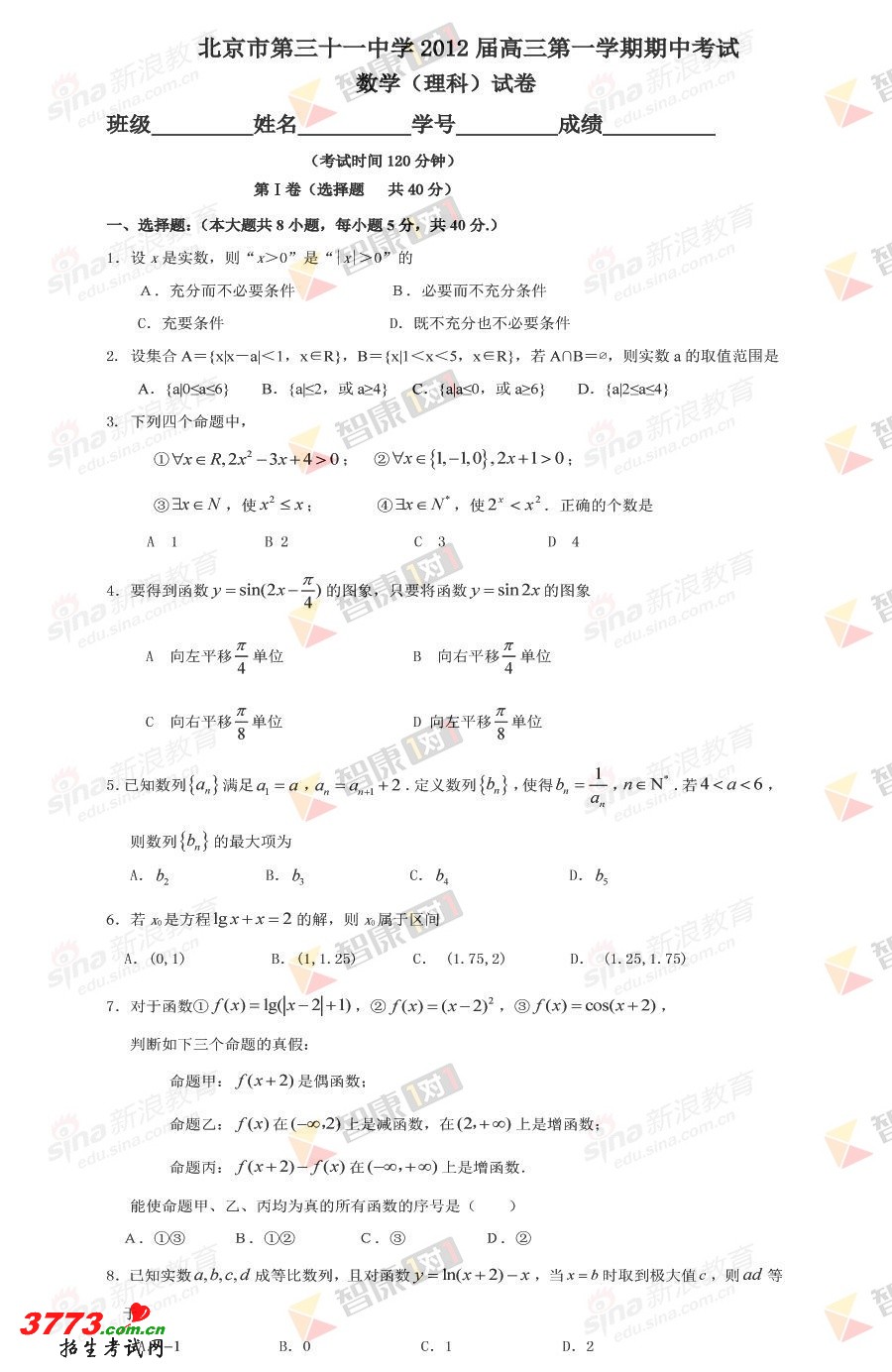 北京三十一中2012高三上学期期中考试理