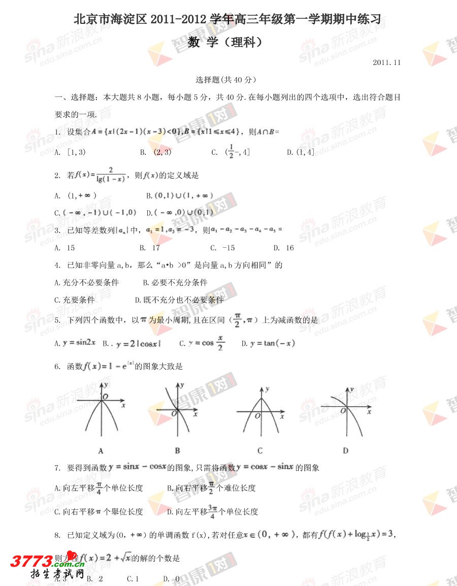 2012年北京市海淀区高三上学期期中考试理科数学试卷及参考答案