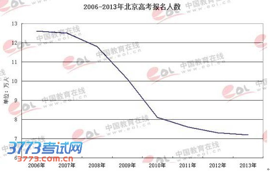 3773考试网数据显示,2013年高考全国共912万考生报名参加,其中,2013年北京高考报名人数再次下降,共计72736人报名参考高考,比去年减少了700余人。这已是北京高考报名人数连续第七年下降!