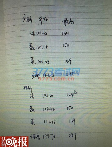 今天上午,市考试院发言人臧铁军介绍了今年高考的各科平均分,其中文史类:语文平均分101.62,最高分144;数学平均分109.18,最高150;英语平均分100.28;最高149;文综平均分183.08,最高275分。理工类:语文平均105.10,最高分144;数学平均分108.64,最高150;英语平均分111.15,最高149;理综平均分199.73,最高287分。