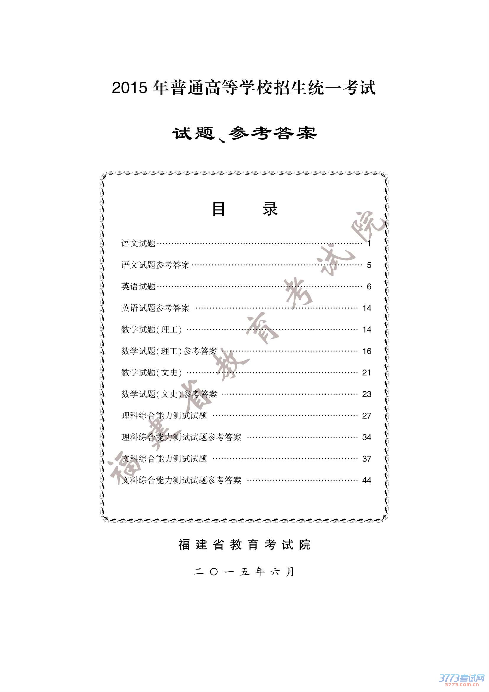 链接:2015年福建省普通高考各学科试题及参考答案