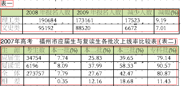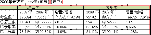 2009年高考考生生源减少。理科比去年减少17523人,减幅9.19%。文科减少6672人,减幅7.01%(见表一)。