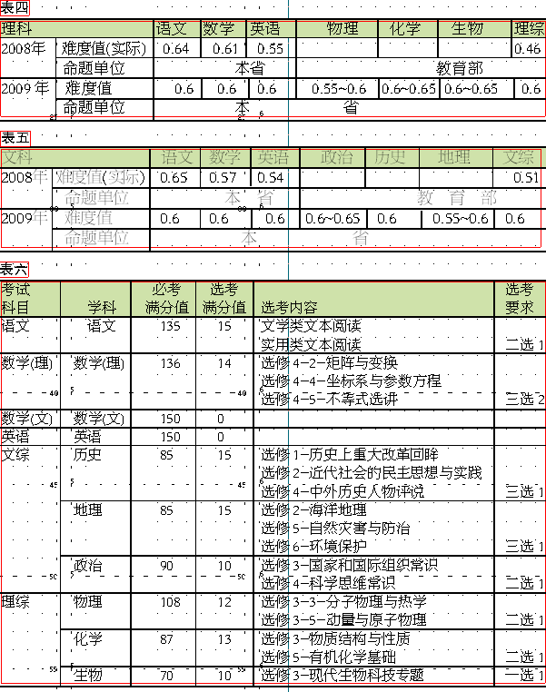 课改后首次高考,许多考生担心新考点(新知识点)、新考法、新要求等。因此,2008年各批次招生都“爆满”,才出现今年复读生剧减的情况。教育部、省教育厅提出的“稳字挂帅”、“平稳过渡”要求,为课改后的高考命题指明了方向。“平稳过渡”中的“过渡”体现在高考试卷上,最主要是试题分为必考题和选考题。例如,语文、理科数学、物理、化学、政治、历史、地理等学科均设有2~3题选考题(见表六)。“平稳”则防止试卷难易大起大落,要求同学科的选考题难度值相同或相近,防止倚轻倚重,因此选考题的难度值比较适中,各地市的质检试卷也证明了这一点,许多一般校的考生都有分可得。这些对广大考生是有利的,而且也有利于促进选考模块的教学。