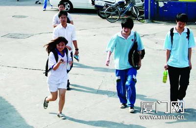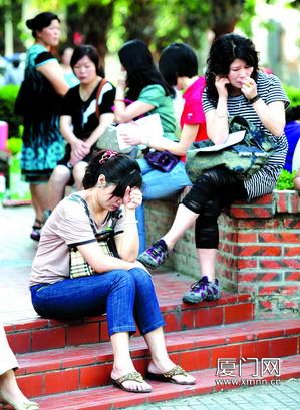 7:40,厦门最大的高考考场——双十中学考场门口,汇聚了数十位考生。他们横坐一排,或谈笑或温习,寥寥几位家长远远观望。
