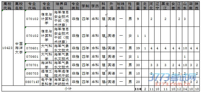 根据教育部、总政治部《关于做好2015年招收国防生工作的通知》精神,中国海洋大学2015年将面向全国9个省、市招收110名国防生,详见招生计划表。