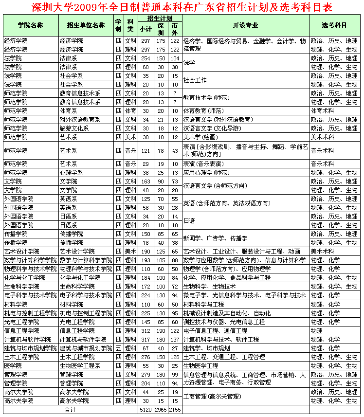 深圳大学2009年全日制普通本科在广东省招生计划及选考科目表