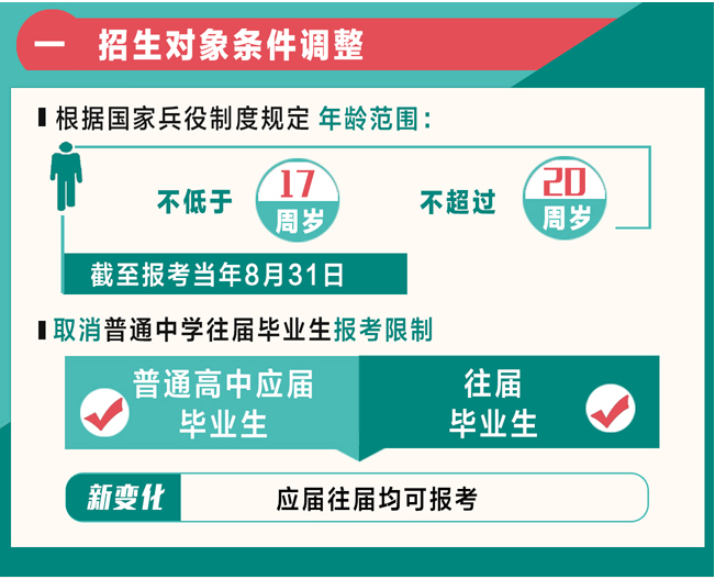 从2015年起,根据国家兵役制度规定,报考军事院校和国防生的考生最低报考年龄均不得低于17周岁、不超过20周岁(截至报考当年8月31日);取消普通高中往届毕业生报考限制,符合条件的普通高中应届、往届毕业生均可报考。