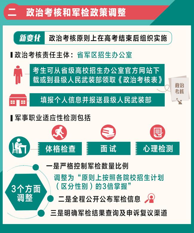一是调整了政治考核的组织时间。为了增强政治考核的针对性、有效性,避免人力、物力浪费,政治考核主要在高考结束后组织实施,并由省军区招生办公室在投档录取前将考生政治考核结论与军事职业适应性检测结论一并送交省级高校招生办公室。二是简化政治考核组织流程。明确省军区招生办公室为政治考核的责任主体,负责确定政治考核组织程序和完成时限。考生可从省级高校招生办公室官方网站下载或到县级人民武装部领取《政治考核表》,填报个人信息并报送县级人民武装部。县级人民武装部扎实做好政治考核工作,并按时将政治考核合格考生名单、《政治考核表》集中报送省军区招生办公室
