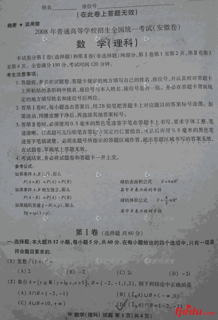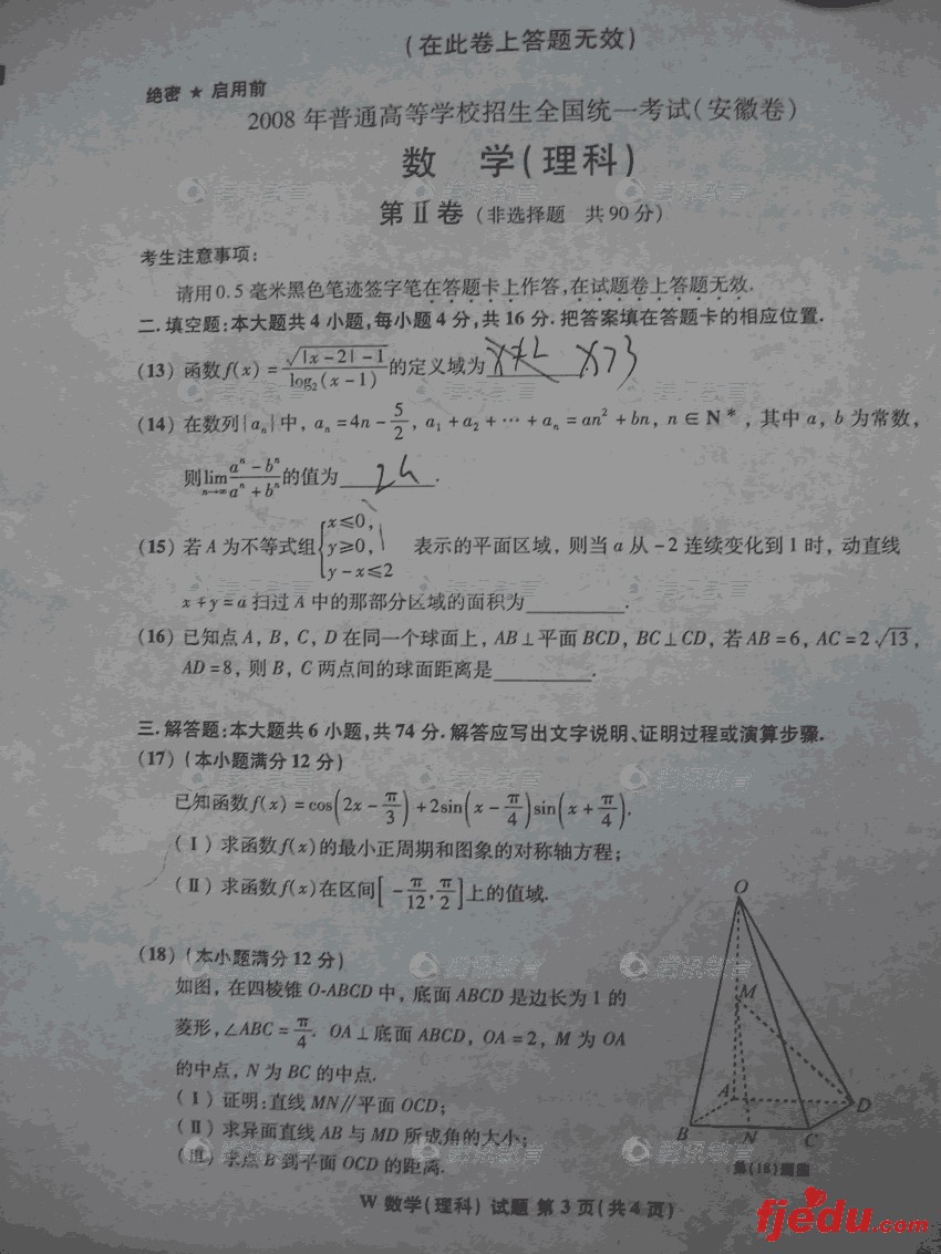 2008年高考理科数学试题安徽试卷