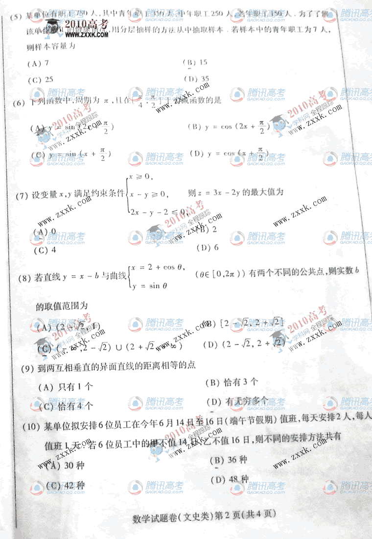 2010年高校招生全国统一考试文数(重庆卷) 2010年高考文科数学试题(重庆卷)