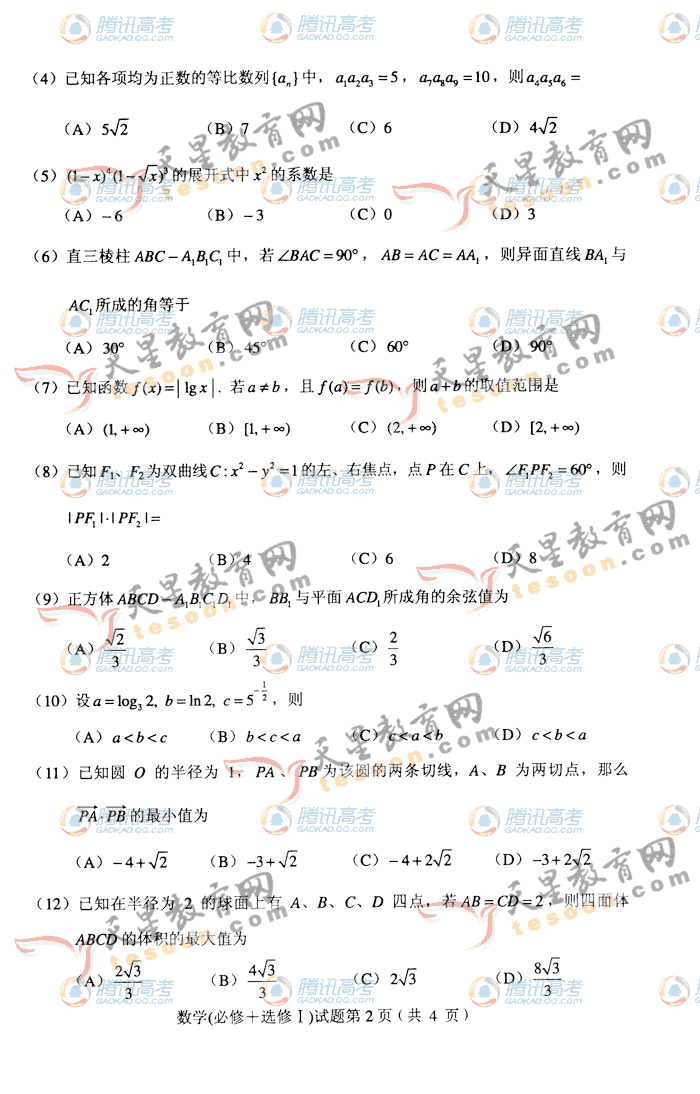 2010年高校招生全国统一考试文数(全国1卷) 河北 河南 山西 广西 西藏