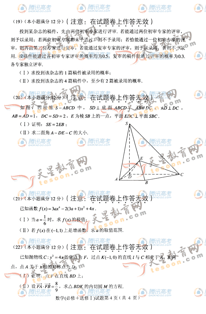 2010年高校招生全国统一考试文数(全国1卷) 河北 河南 山西 广西 西藏