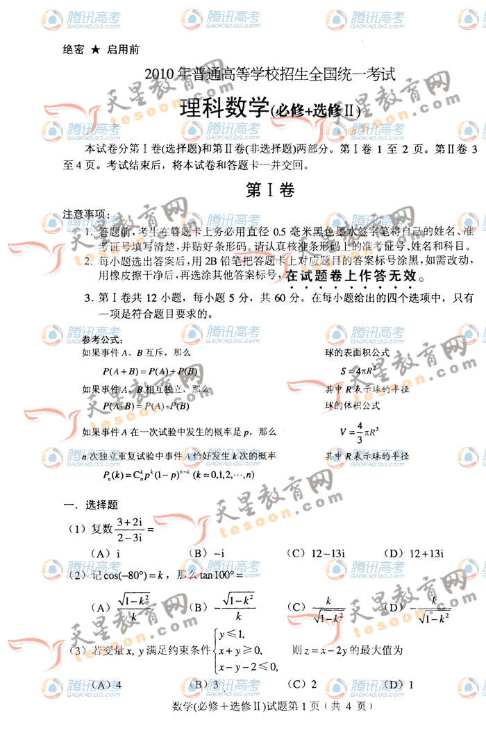 2010年高校招生全国统一考试理数(全国1卷)河北 河南 山西 广西 西藏