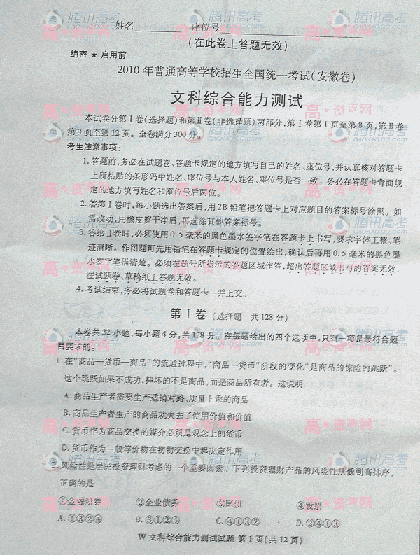2010年高校招生全国统一考试文综(安徽卷) 2010年安徽高考文综试题试卷(文科综合)