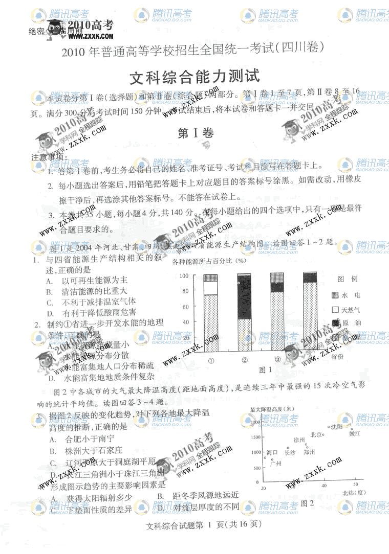 2010年高校招生全国统一考试文综(四川卷
