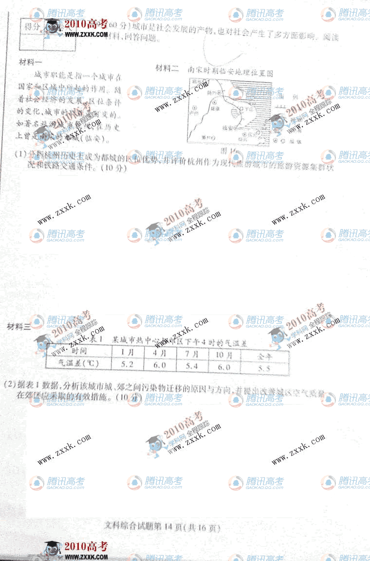 2010年云南贵州甘肃青海新疆内蒙古西藏高考文综试题答案