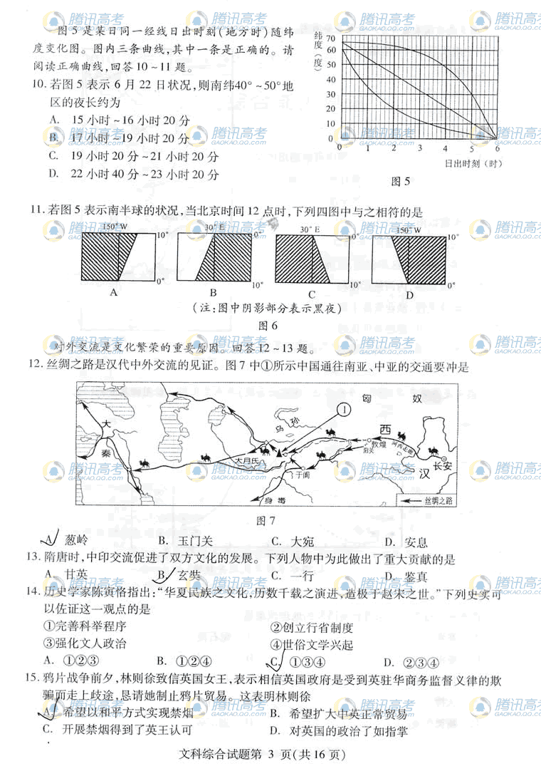 2010年云南贵州甘肃青海新疆内蒙古西藏高考文综试题答案