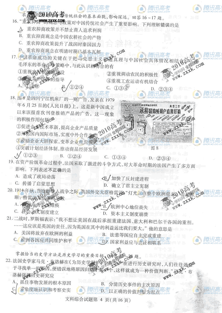 2010年云南贵州甘肃青海新疆内蒙古西藏高考文综试题答案