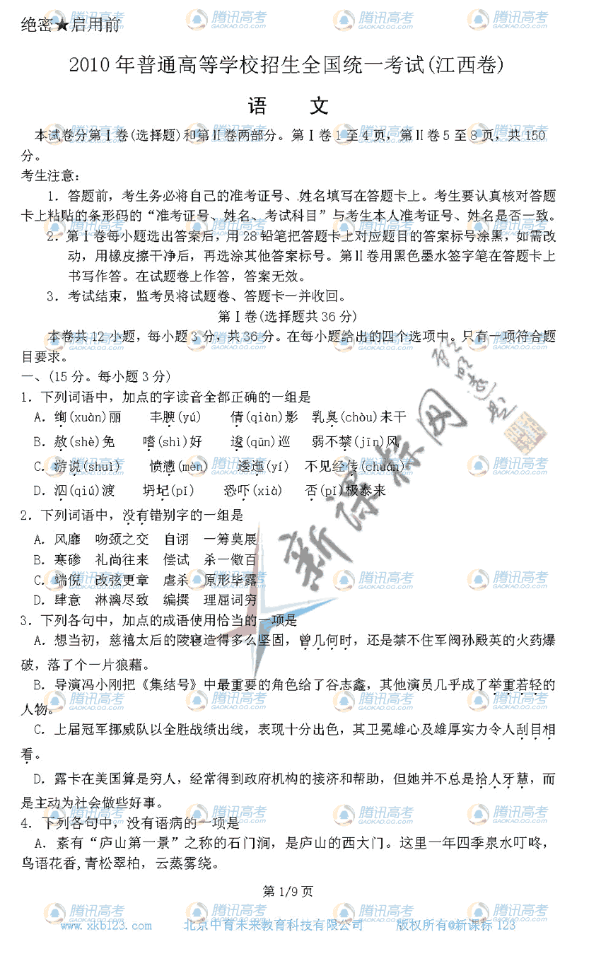 2010年高校招生全国统一考试语文(江西卷)