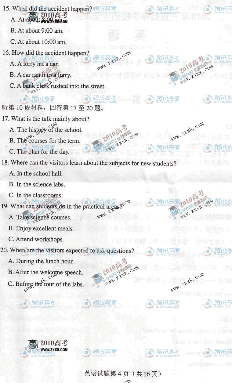 2010年河北 河南 山西 广西高考考试英语(全国1卷)